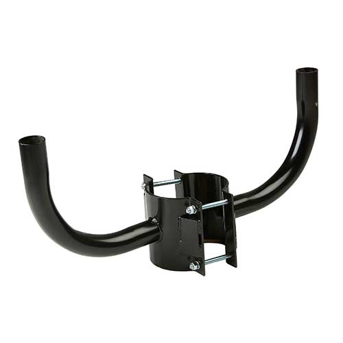 Steel double arm right angle wrap light bracket for round poles allows for concrete and steel pole mounting of street and area lighting fixtures. LED and traditional fixtures can be utilized that slip fit onto the bracket. Available in hot dipped galvanized, dark bronze, black, dark grey, white or natural aluminum finishes. Fixture mounting hardware not included. Indicate pole size when ordering. Single arm and 18 in. arms are also available. This units arms are 14 in. in distance from pole. Square and Octagonal pole wrap brackets are also available.